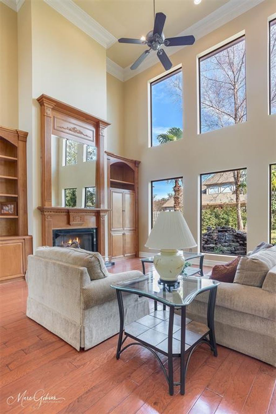 This home located in the gated community Lakeside on Long Lake is nestled on a top of a hill with views of the lake! Upon entering into the home you walk into a grand living room with a large mantled fireplace, built-ins and picture perfect shatter proof windows over looking into the Koi (goldfish)...