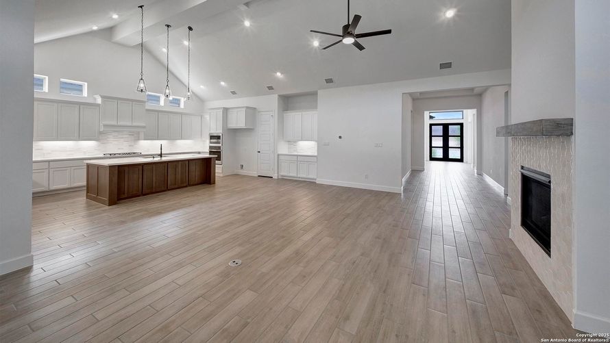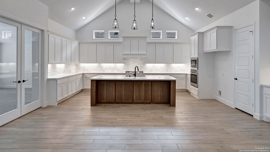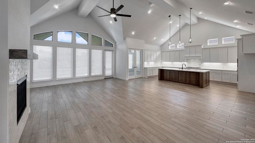 READY FOR MOVE-IN! Home office with French doors set at entry with 12-foot ceiling. Extended entry leads to open family room, dining area and kitchen with 17-foot ceilings throughout. Family room features wall of windows and wood mantel fireplace. Kitchen features generous counter space, 5-burner...