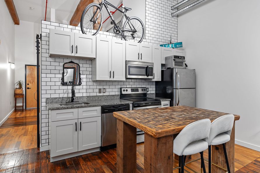 Newly renovated in the charming & historic Werthan Lofts! Fall in love with the open floor plan featuring soaring ceilings, extra large windows, and beautifully refinished original hardwood floors. The updated kitchen has granite countertops, stainless appliances, and a custom butcher block island...