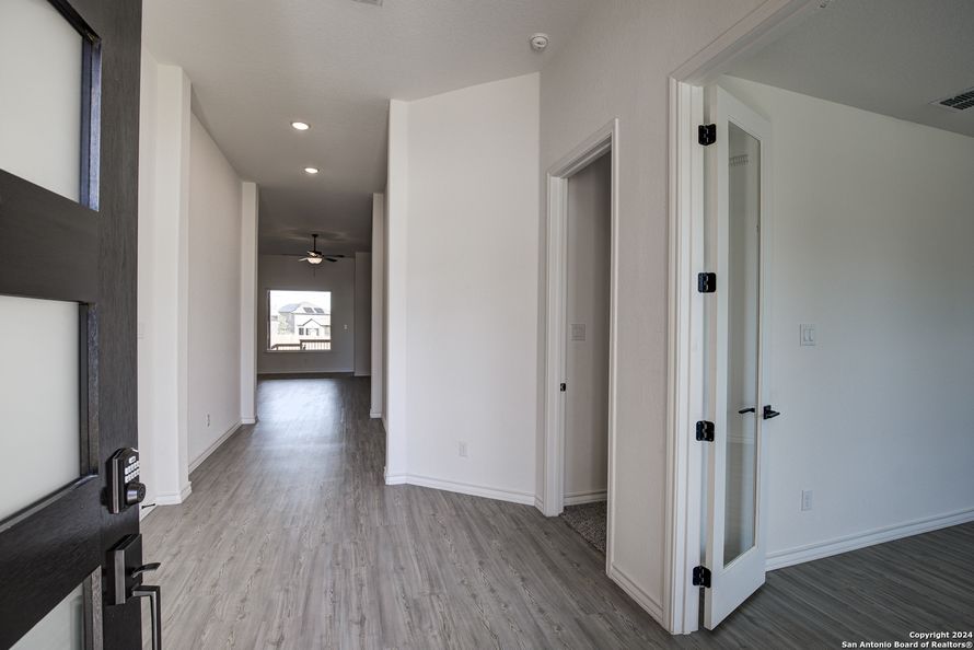 **The Garner's covered entry and impressive foyer with soaring 12' ceiling flow into the expansive family room, with a view of the sought-after covered outdoor living beyond. The kitchen overlooks the dining area and the family room, which features a corner fireplace. A center island highlights the...