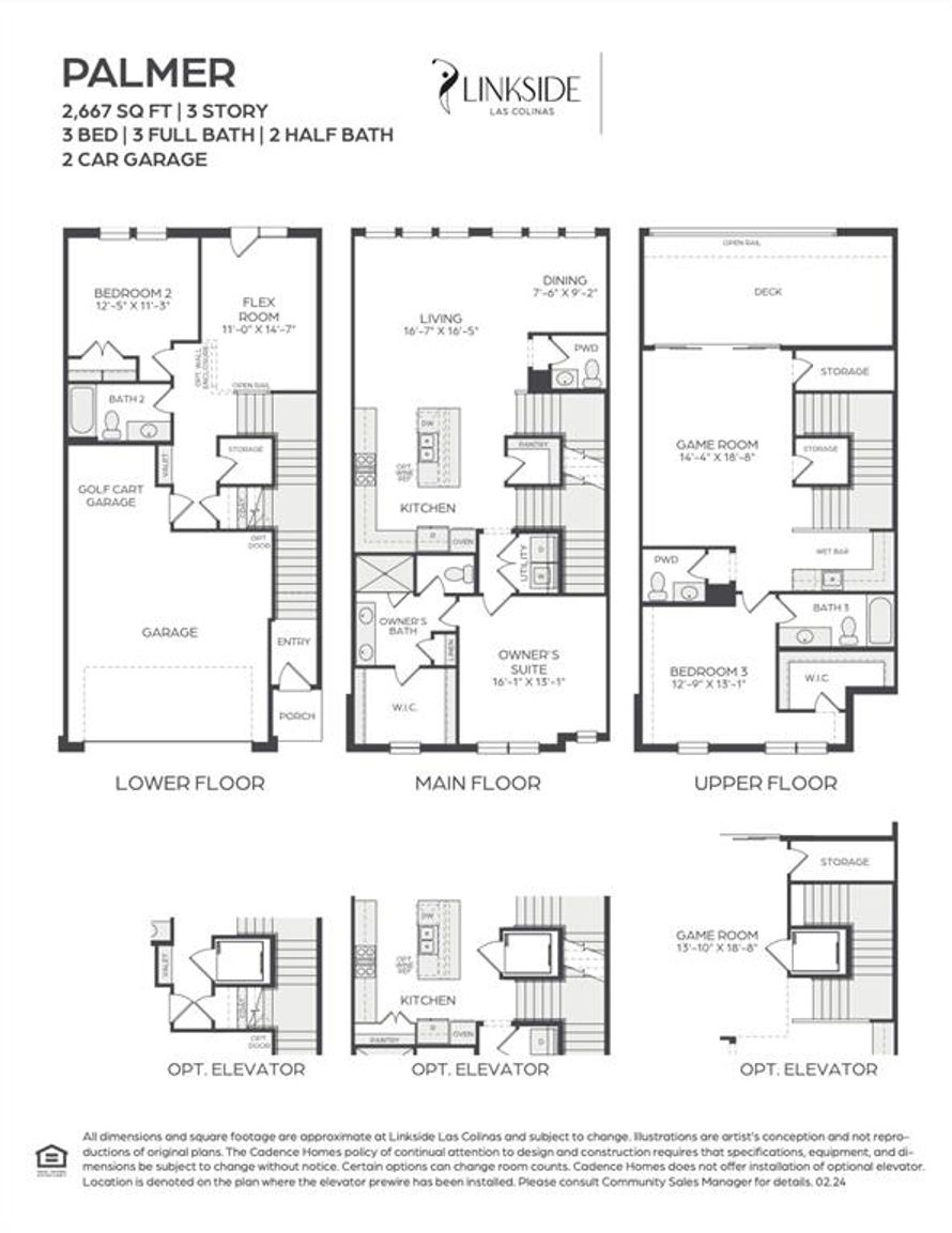 CADENCE HOMES PALMER floor plan. Three Story, modern elevation, South Facing, gray brick, open living room, dining room, & kitchen with engineered flooring, upgraded tile, and countertops. Spacious bedrooms, study, gameroom, flex room, utility room with upgraded carpet & ceramic tile. 2 car...