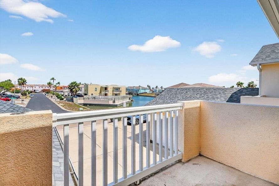 Enjoy the canal water view from the balcony of this North Padre Island 2-bed, 2.5-bath, 1-car garage two-story townhome in the private Bayview at Padre Island Townhomes, featuring a 2025 roof, 2016 AC, updated upstairs flooring (No carpet!), and a thoughtful layout with both bedrooms upstairs...