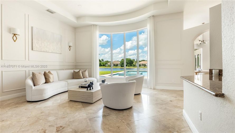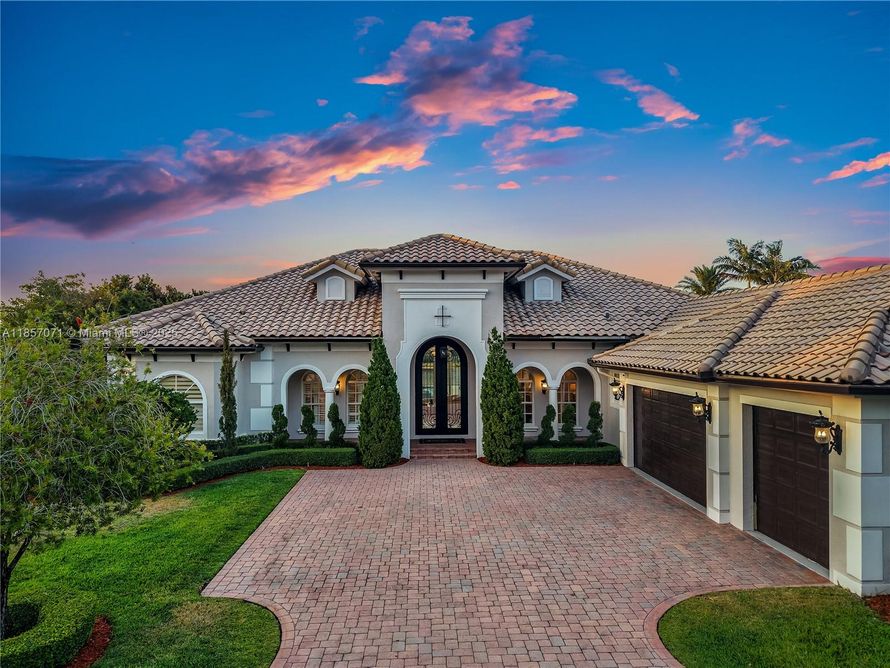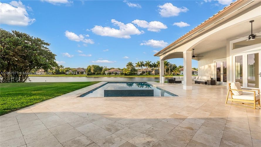 Stunning renovated 5-bedroom, 5-bathroom + office lakefront estate on 1 acre in gated Woodbridge Ranches, Davie. Features include a 15-foot-high iron door, new impact windows and doors (2023), a heated pool and infinity spa (2020), a gourmet kitchen with an island & wet bar, and marble floors....