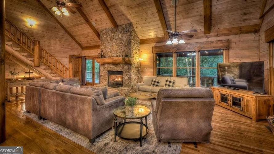Look no further for the ultimate primary or vacation rental experience! The cabin boasts soaring 26-foot ceilings in its grand great room, adorned with exposed beams and a striking stack stone rock fireplace. The expansive gourmet kitchen features lavish granite counters, sleek stainless steel...
