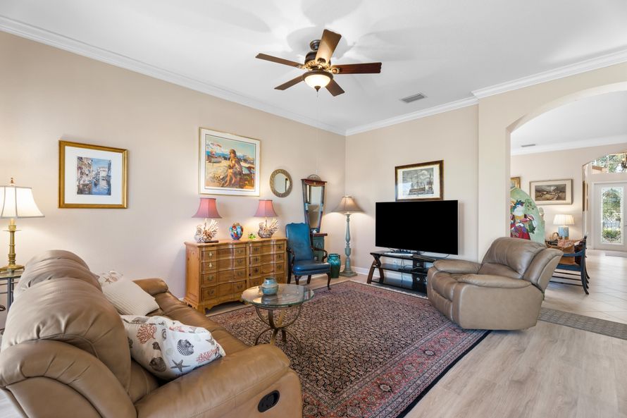 Beautifully maintained 3BR/2BA/2CG home in Vero Beach. LVP & Tile flooring throughout. Crown molding throughout the living areas. Custom kitchen cabinets, Large primary bedroom with coffered ceilings and 2 walk in closets. Primary bathroom has dual sinks, separate shower and separate soaking tub....