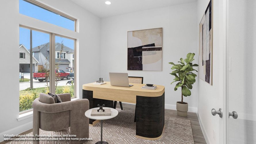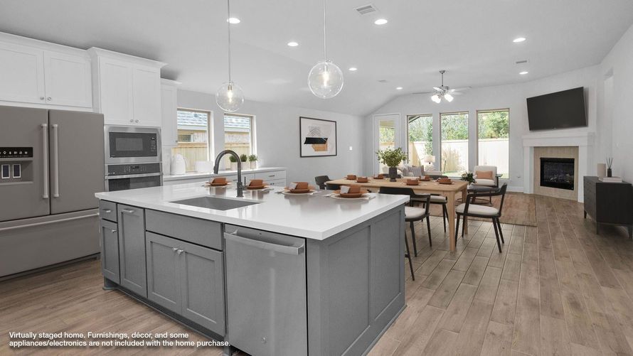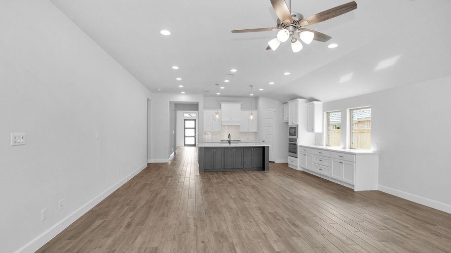 READY FOR MOVE-IN! Home office with French doors set at entry with 12-foot ceiling. Extended entry leads to open kitchen, dining area and family room. Kitchen features corner walk-in pantry, 5-burner gas cooktop, generous counter space and island with built-in seating space. Dining area flows into...