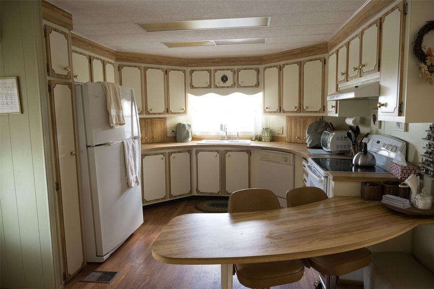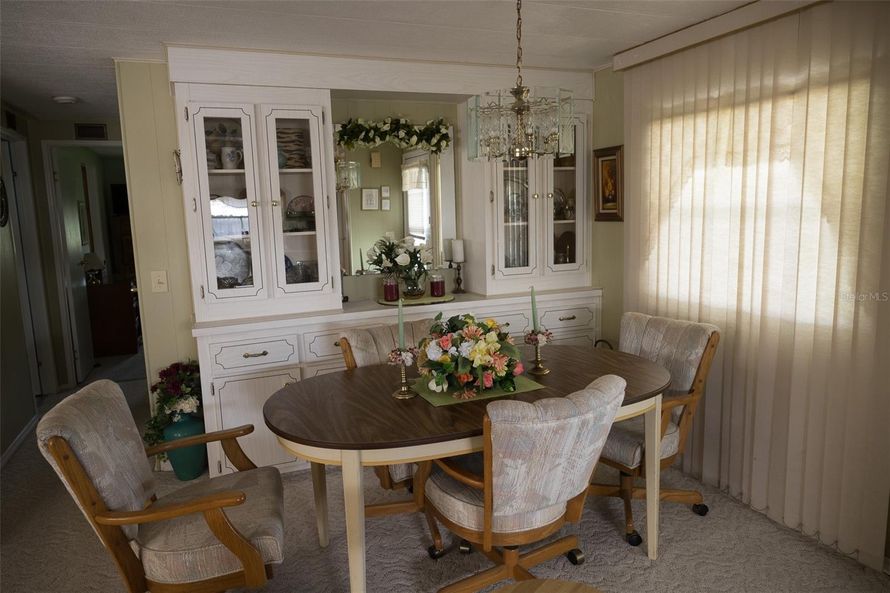 This home features 2 bedrooms and 2 bathrooms. Entry leads to the kitchen, which includes a breakfast bar, a pantry, and new appliances, including a refrigerator and an oven/stove. The dining room has a built-in hutch, while the living room boasts a sliding door that opens to a front raised patio...