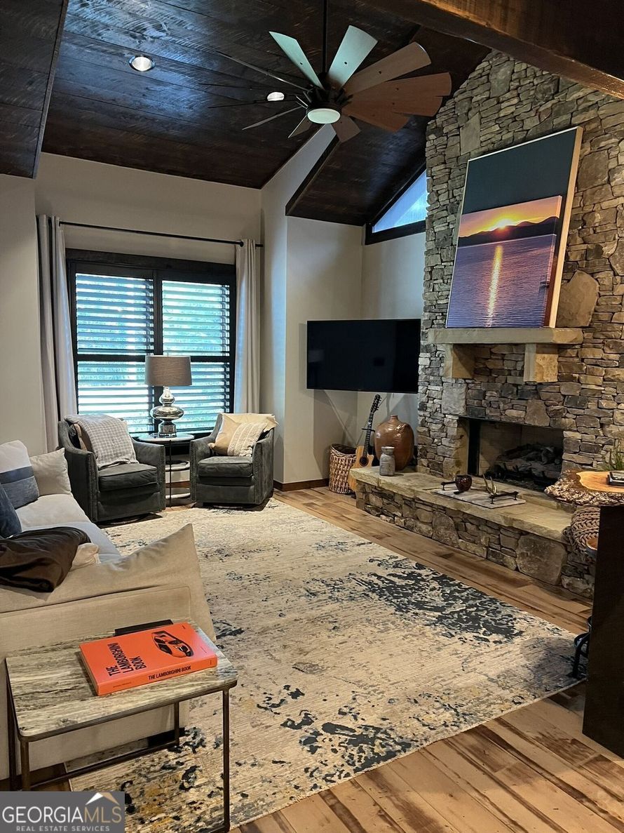 Stunning custom home located in a quiet residential area, in the heart of Blue Ridge! Enter and take in the vaulted ceilings and custom stone fireplace. The kitchen features custom wood cabinets, high end appliances and a stacked stone breakfast bar. Double French doors draw in loads of sunlight...