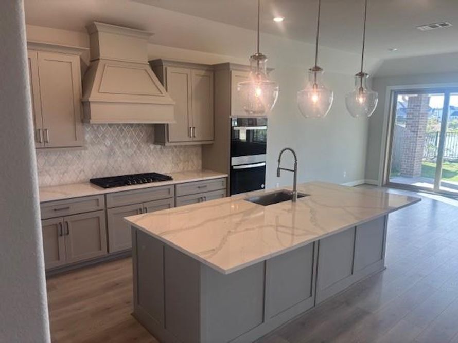 Shea Homes 5029D Plan. Beautiful 1-story All Brick Home on a waterfront lot extended cover patio with sliders to the outside, with 4 bedrooms, 3.5 baths. Luxury laminate plank and wood flooring throughout, with plush carpet only in bedrooms. The kitchen boasts a 5-burner gas cook top and nice...