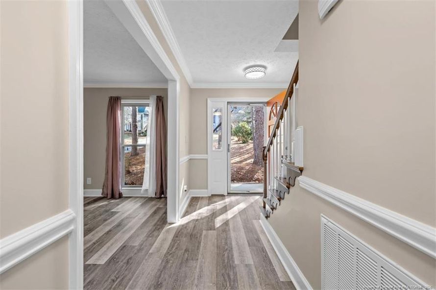 Come check out this exquisite two-story home nestled in the sought-after Gates Four neighborhood in the Jack Britt school district. The home is nestled on a beautiful, private lot overlooking the 6th green. Downstairs, soak in the sunlight and those stunning golf course views. Stylish LVP flooring...